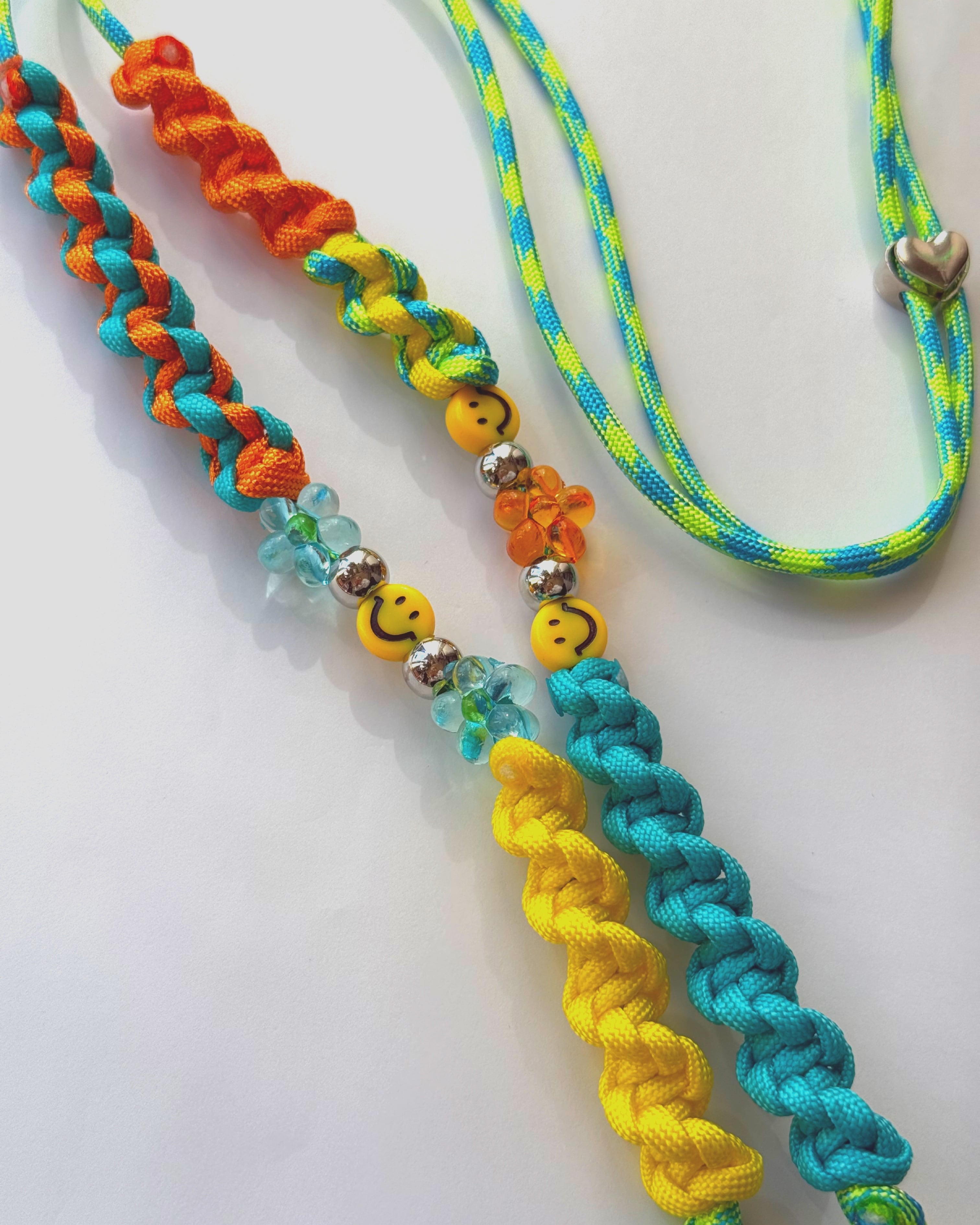 ハートのコードストッパーで長さを調節することができるストラップです。