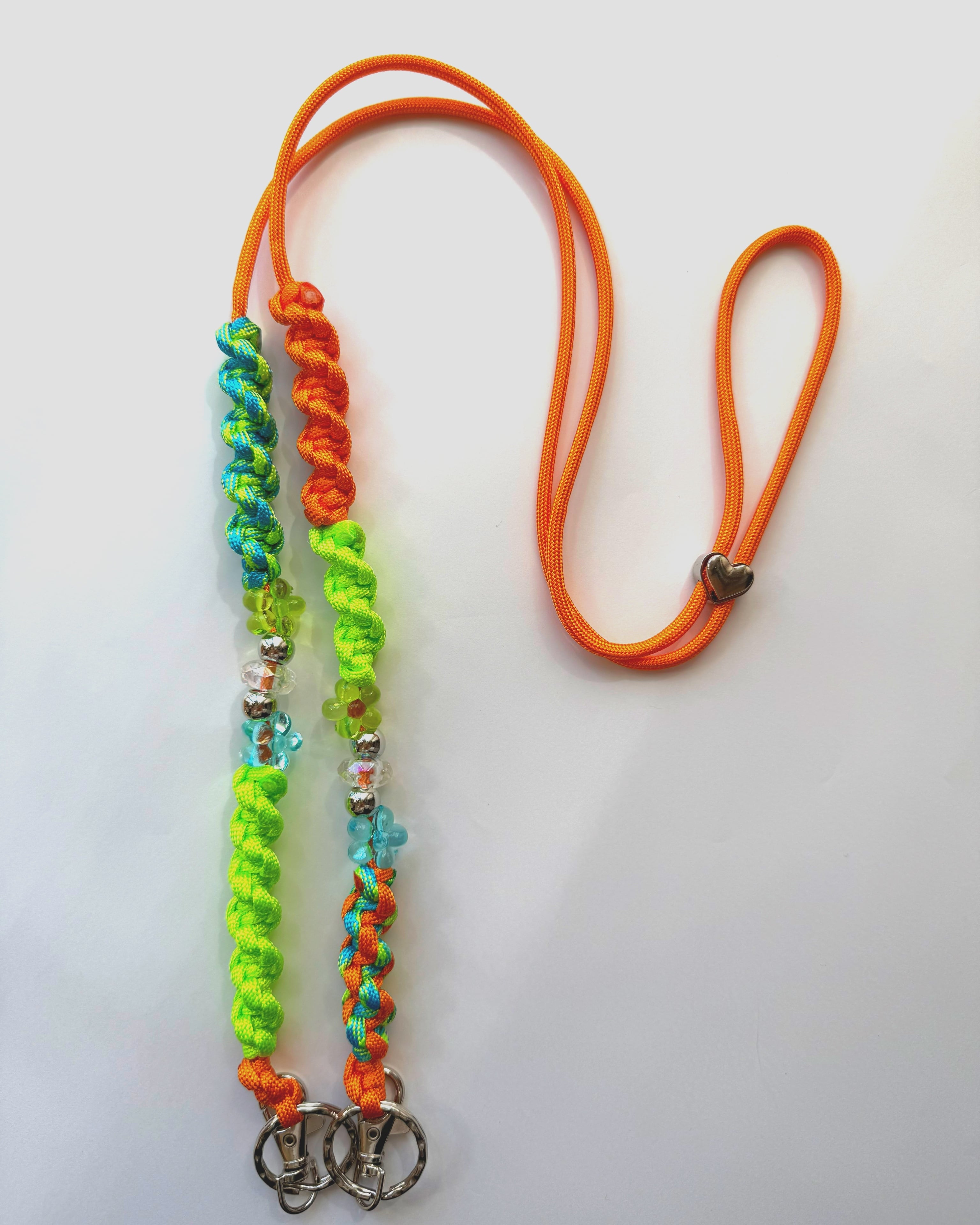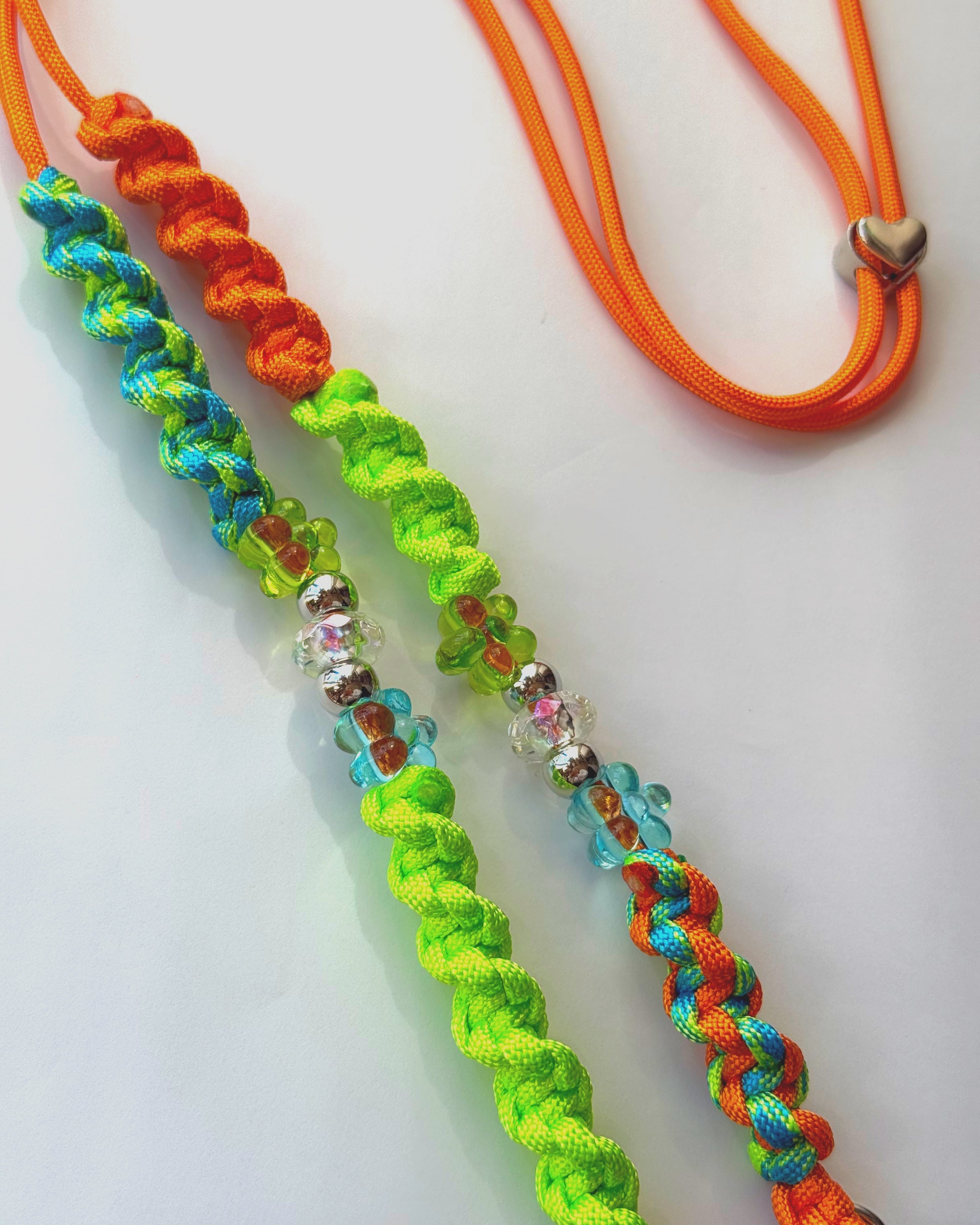 ハートのコードストッパーで長さを調節することができるストラップです。
