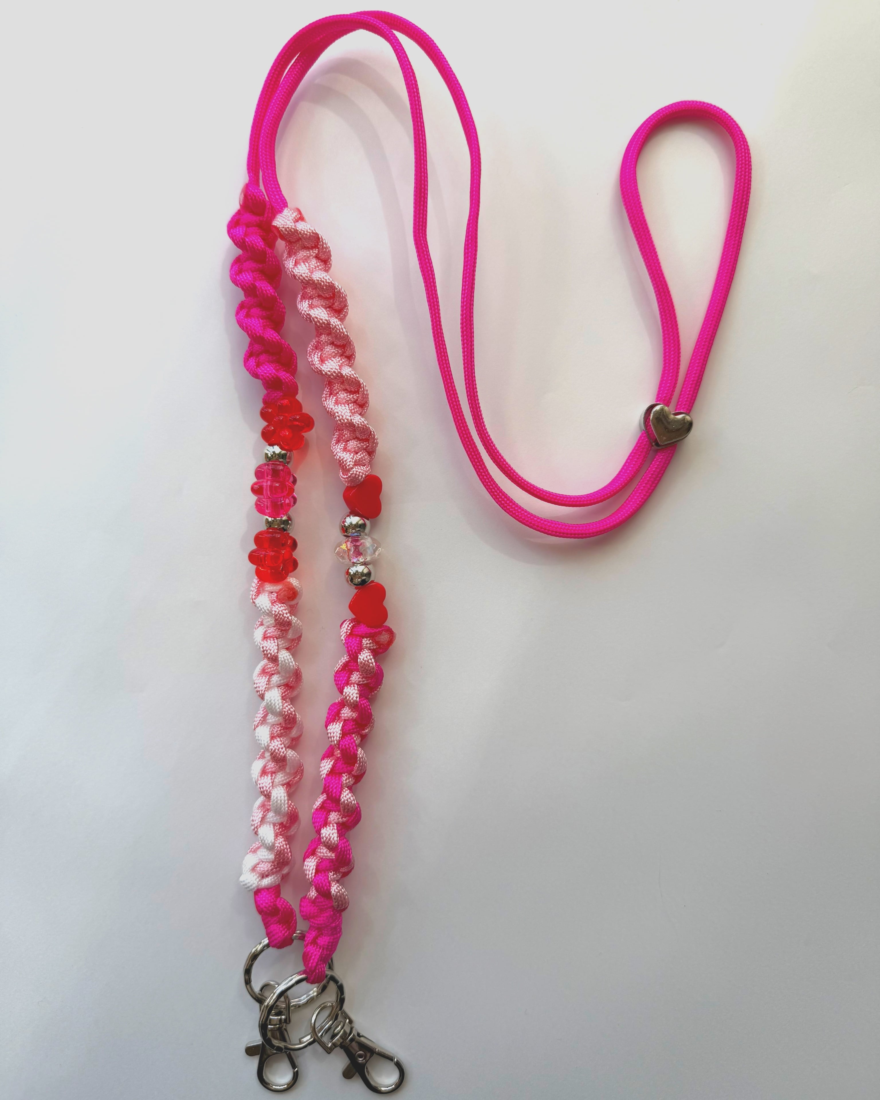 ハートのコードストッパーで長さを調節することができるストラップです。